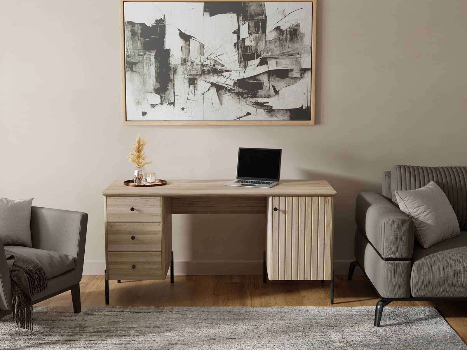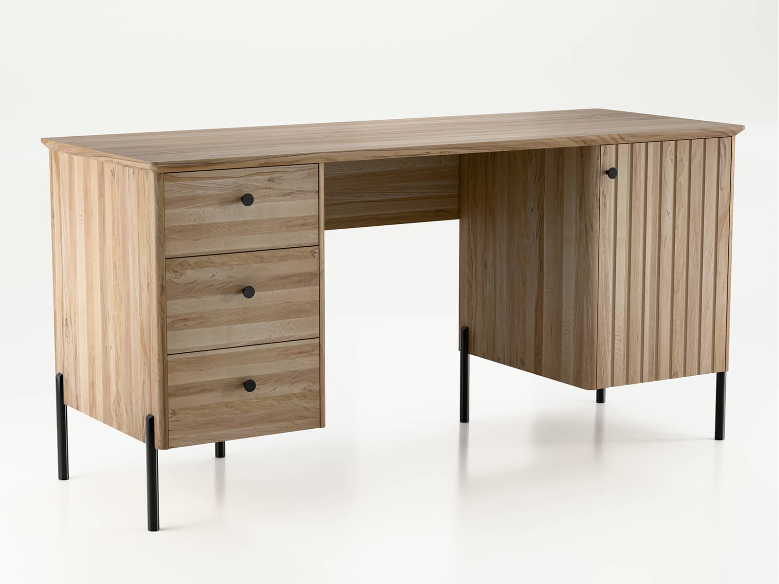Biroul este echipat cu trei sertare spațioase și un dulap cu încuietoare, oferind depozitare convenabilă pentru documente, accesorii și alte obiecte. Sistemul de glisiere BLUM cu închidere silențioasă asigură o utilizare lină, confortabilă și silențioasă, subliniind calitatea înaltă a mobilei.