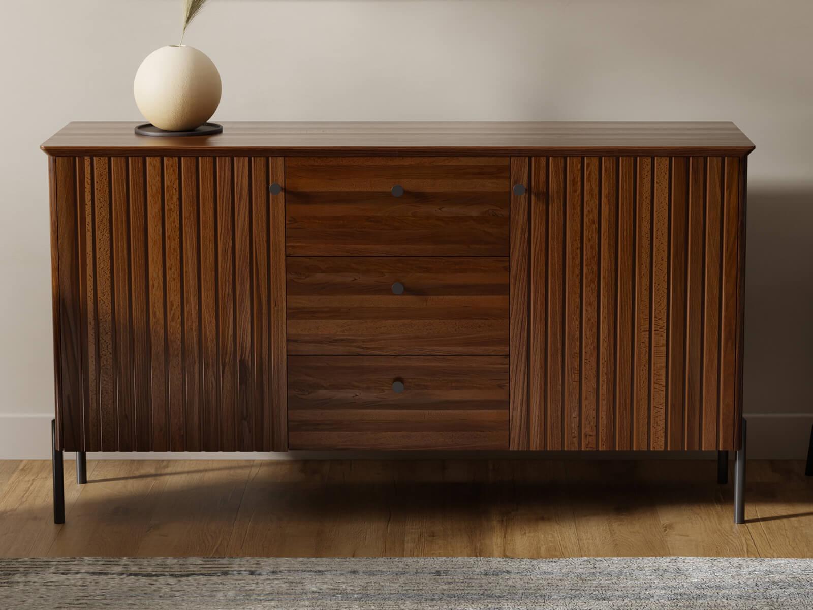 Bufetul dispune de trei sertare spațioase și două dulapuri cu încuietoare, oferind spațiu convenabil de depozitare pentru o varietate de articole - de la haine și textile la documente și accesorii pentru casă. Sistemul de glisiere BLUM cu închidere silențioasă asigură o deschidere lină și silențioasă a sertarelor, subliniind calitatea superioară și confortul său.