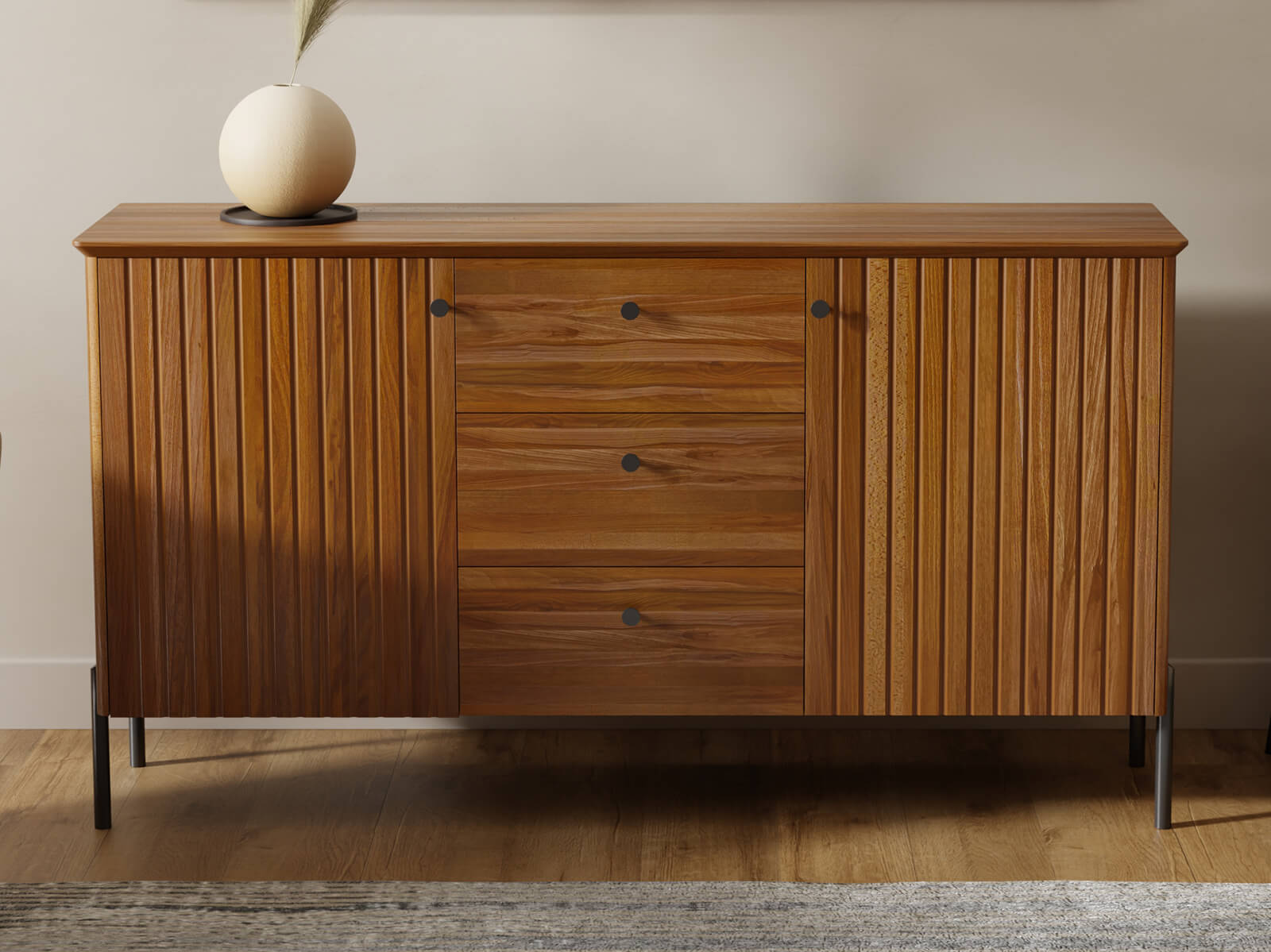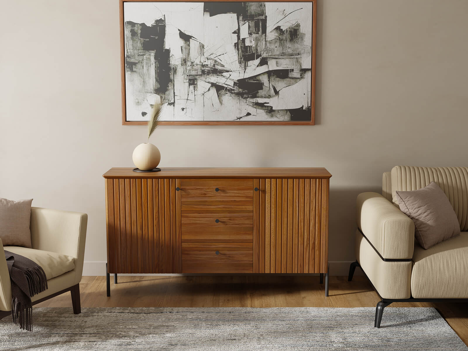 Bufetul dispune de trei sertare spațioase și două dulapuri cu încuietoare, oferind spațiu convenabil de depozitare pentru o varietate de articole - de la haine și textile la documente și accesorii pentru casă. Sistemul de glisiere BLUM cu închidere silențioasă asigură o deschidere lină și silențioasă a sertarelor, subliniind calitatea superioară și confortul său.