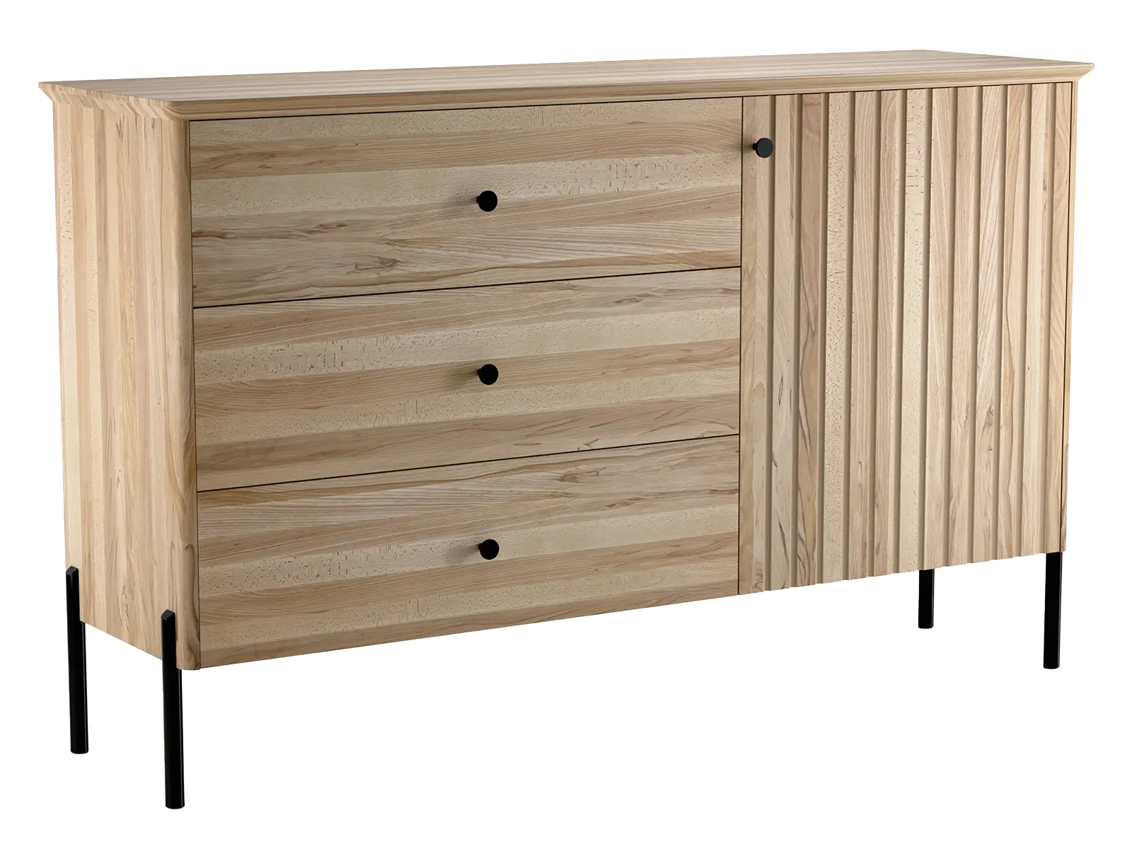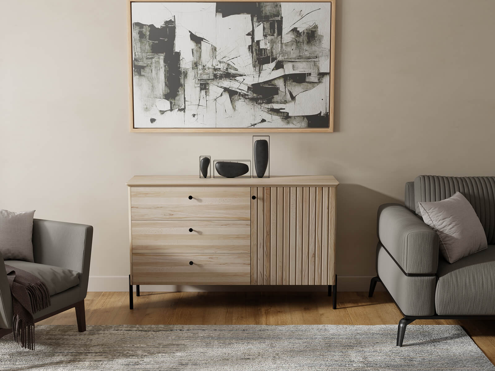 Bufetul dispune de trei sertare spațioase și un dulap cu încuietoare, oferind spațiu de depozitare convenabil pentru o varietate de articole - de la haine și textile la documente și articole de uz casnic. Sistemul de glisiere BLUM cu închidere silențioasă asigură o deschidere lină și silențioasă a sertarelor, subliniind calitatea superioară și confortul său.