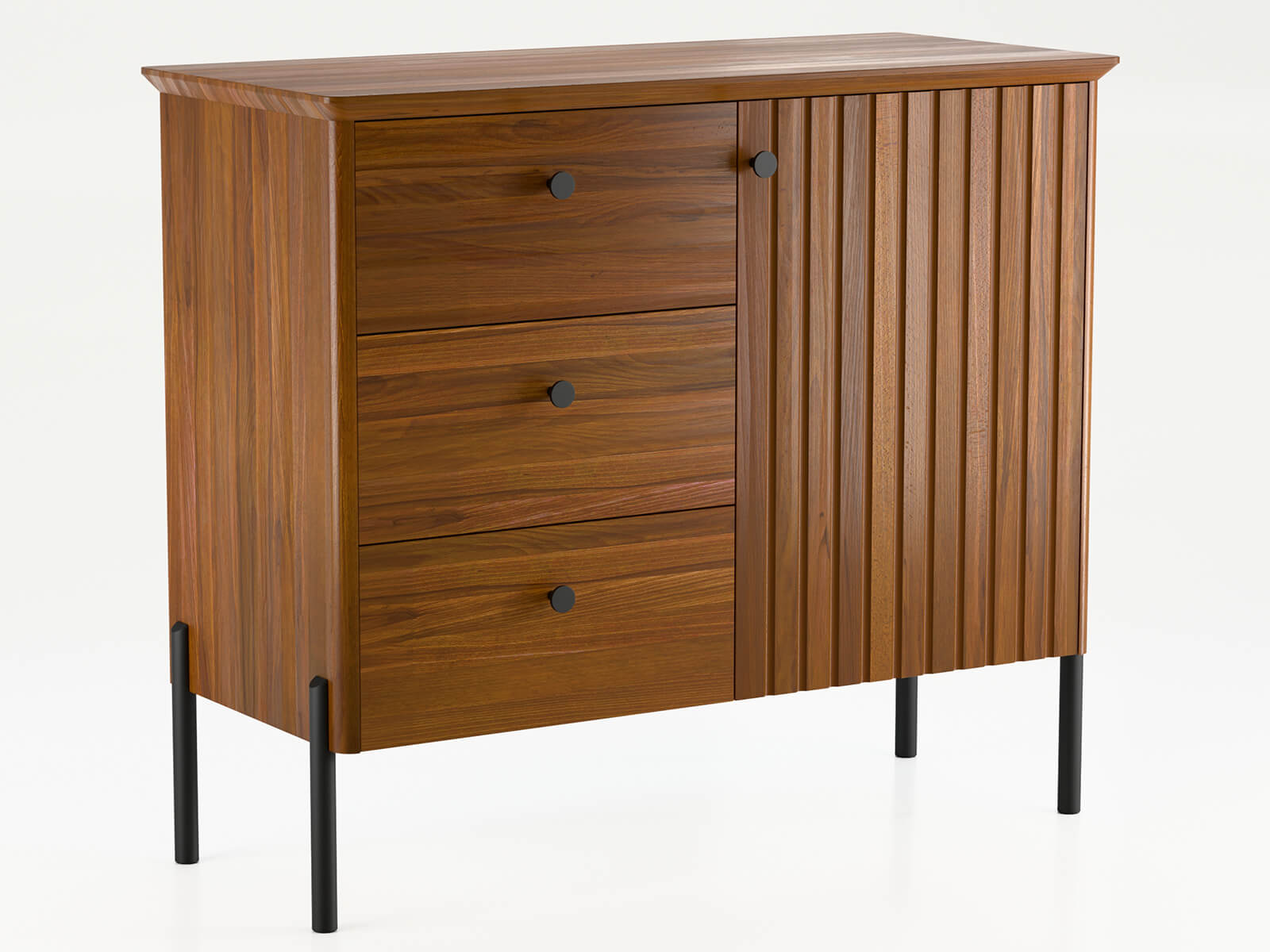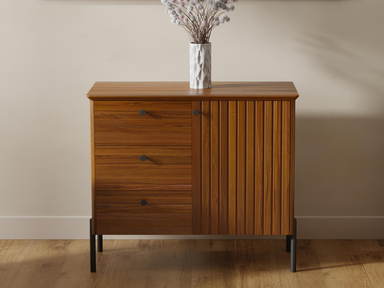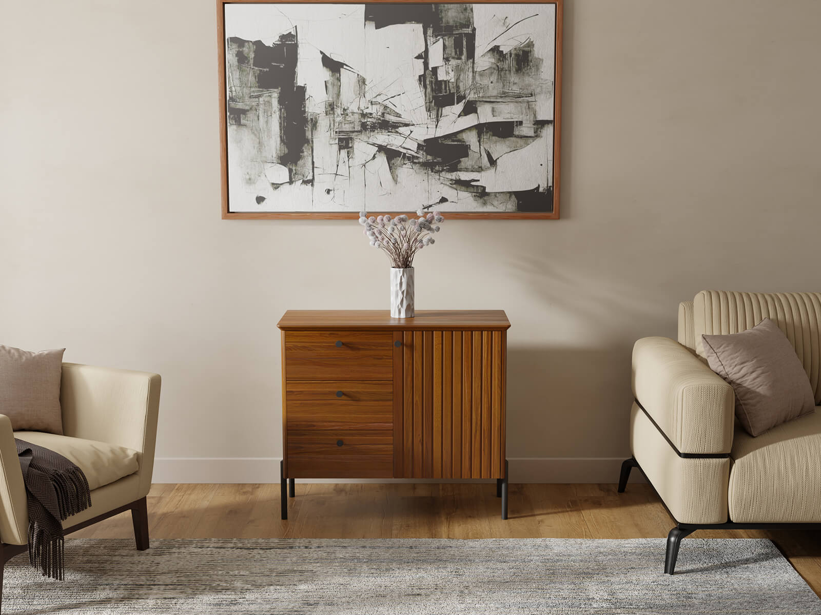 Bufetul dispune de trei sertare spațioase și un dulap cu încuietoare, oferind spațiu de depozitare convenabil pentru o varietate de articole - de la haine și textile la documente și articole de uz casnic. Sistemul de glisiere BLUM cu închidere silențioasă asigură o deschidere lină și silențioasă a sertarelor, subliniind calitatea superioară și confortul său.