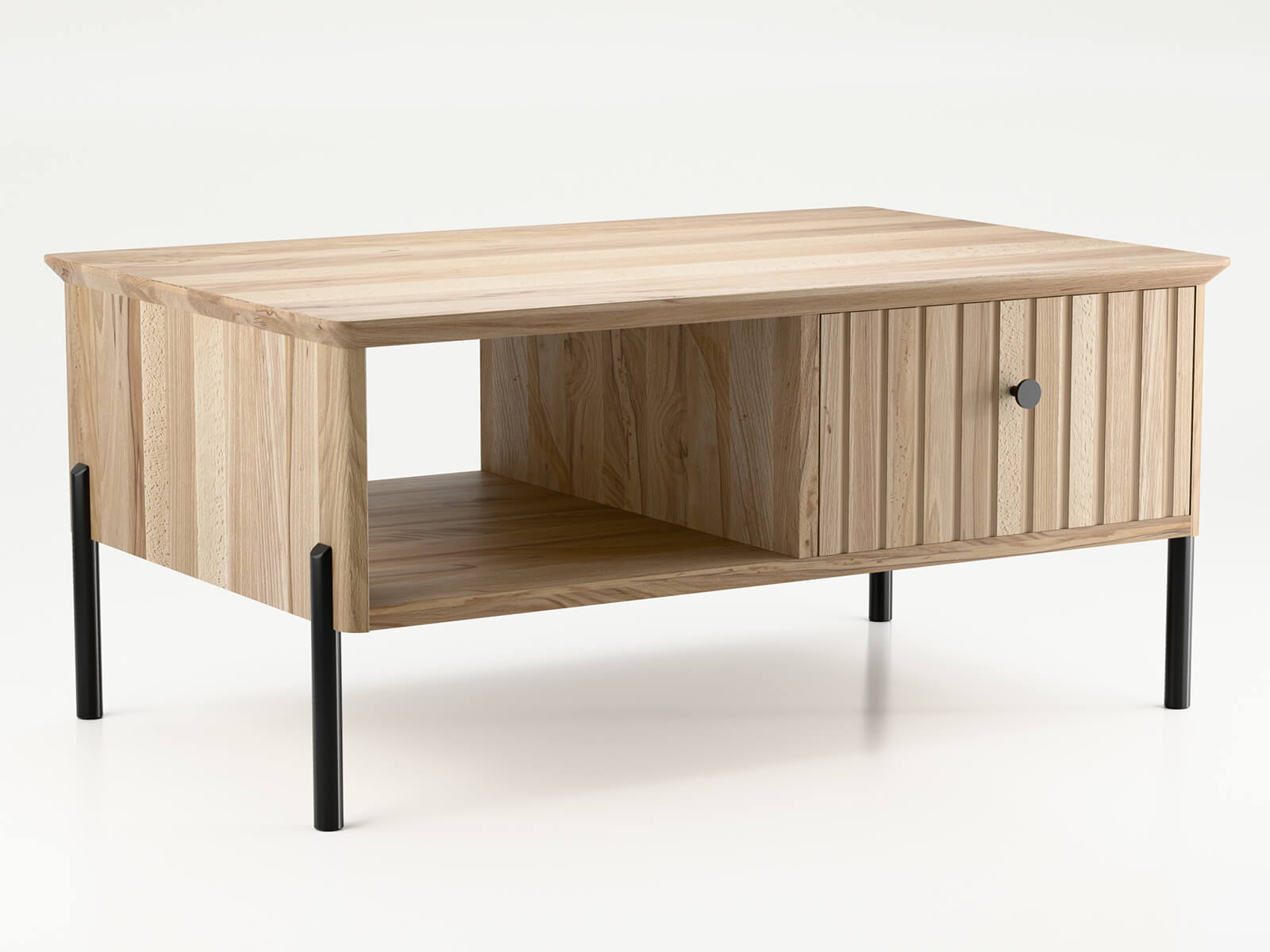 Masa a fost concepută având în vedere caracterul practic, fără a compromite estetica. Dispune de un raft deschis pentru ziare, cărți sau telecomenzi și de un dulap cu încuietoare, cu o față frezată, care permite depozitarea discretă a obiectelor mici, menținând camera de zi ordonată. Dimensiunile sale compacte și forma geometrică o fac un plus perfect atât pentru interioarele mici, cât și pentru cele mari.
