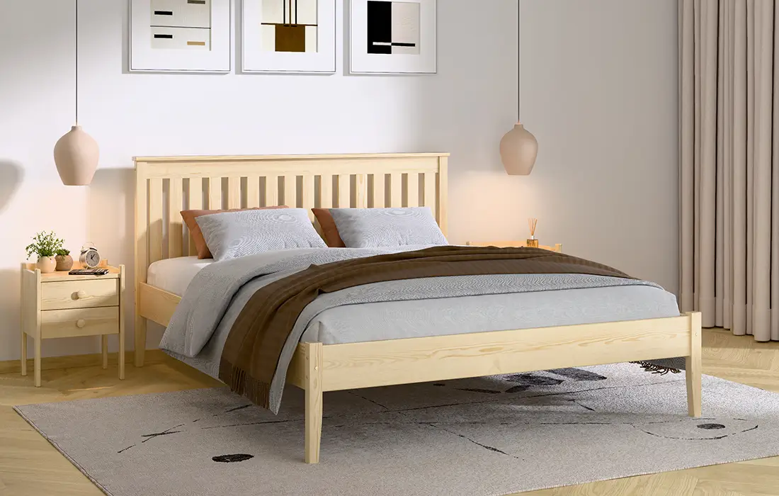 - Culoarea naturală a pinului – aduce căldură și confort în dormitor.
